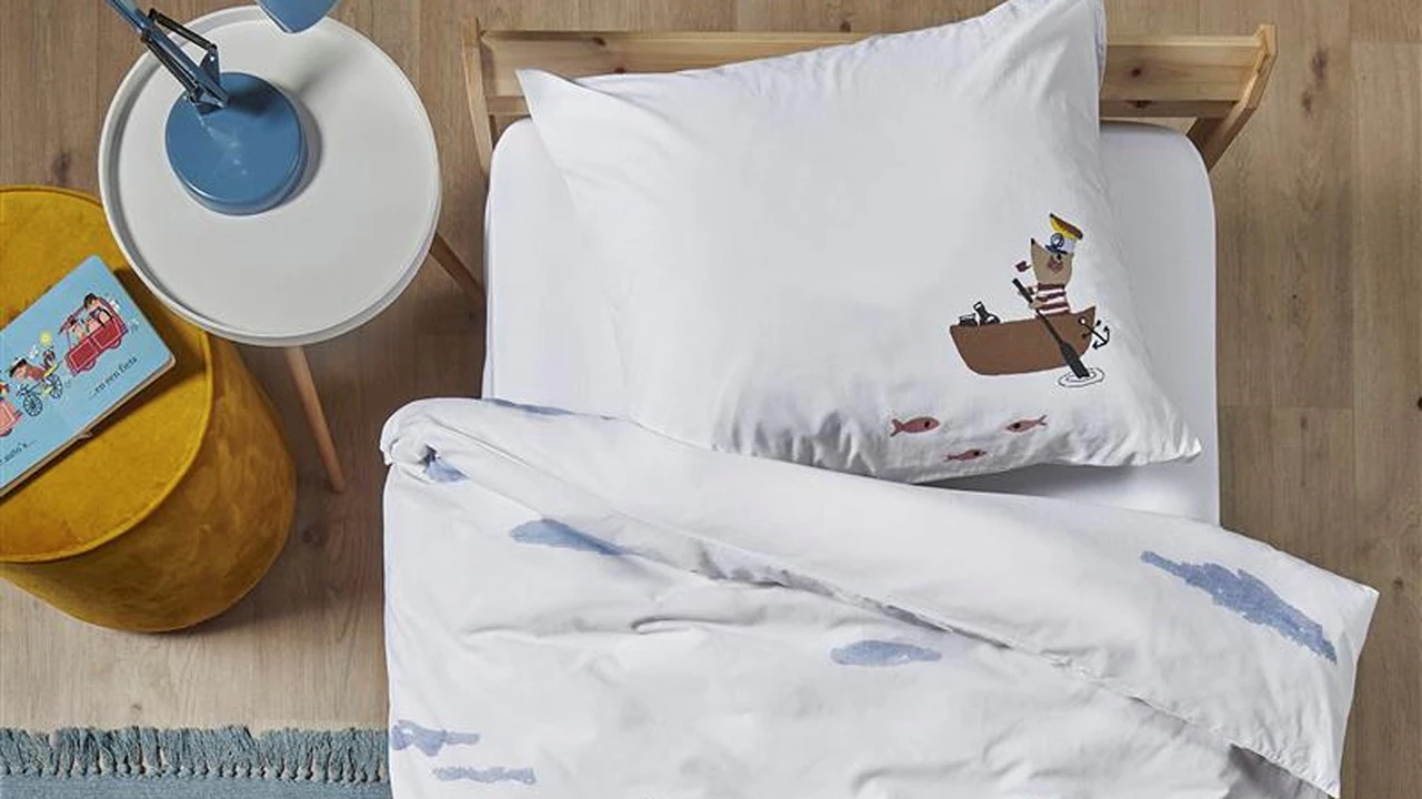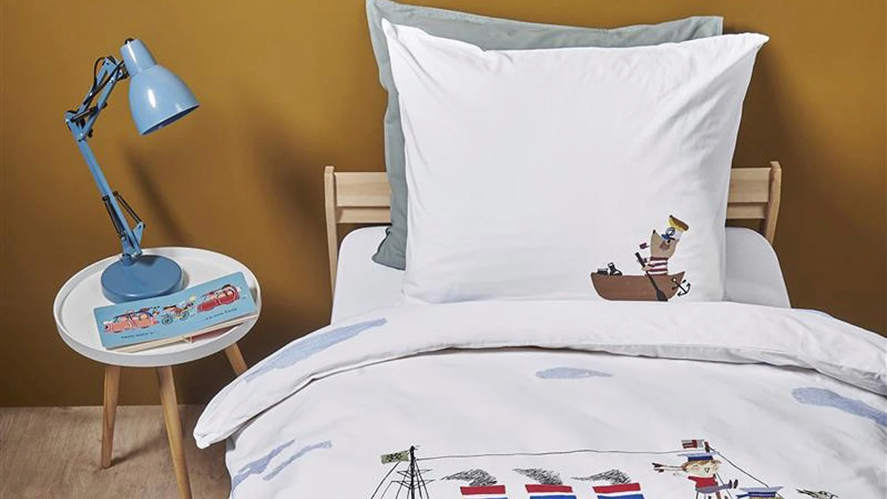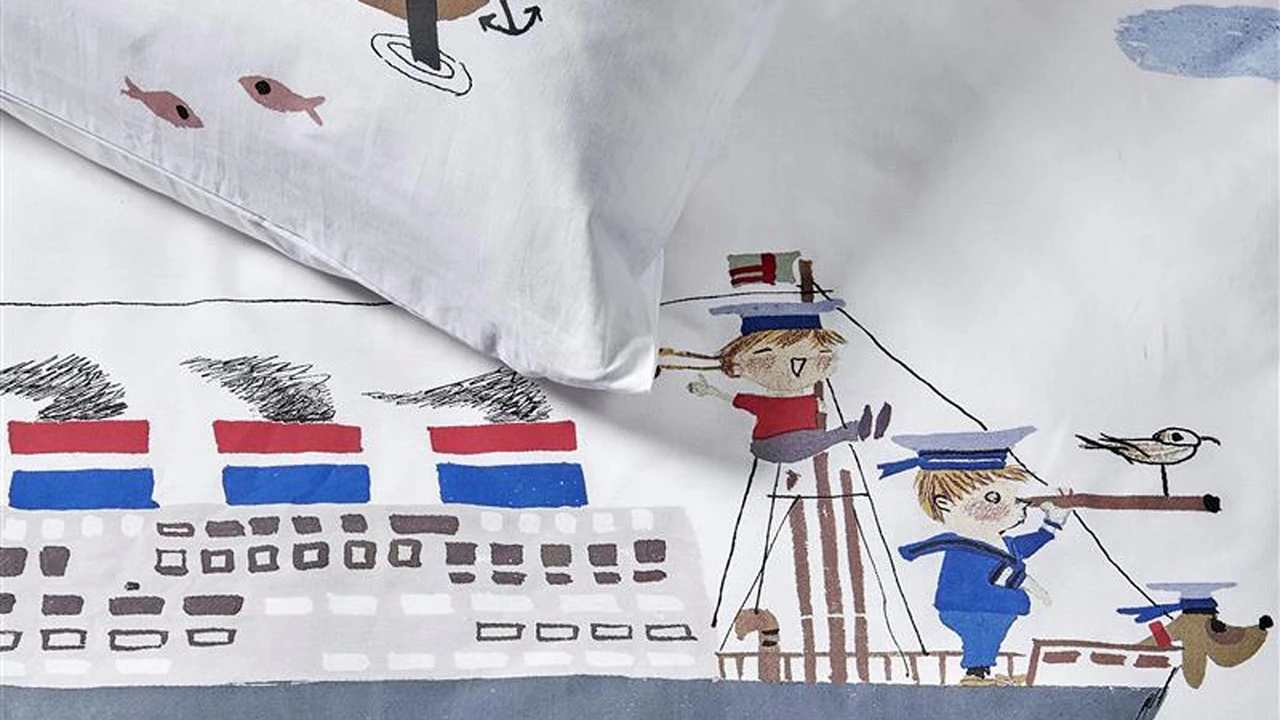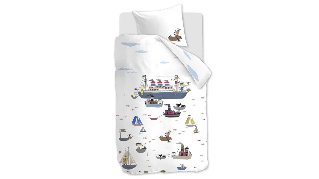 Het kinderdekbedovertrek Bootje Varen laat de prachtige illustraties van Fiep Westendorp zien. Op het kleurrijke overtrek is op speelse wijze het leven op zee afgebeeld. Kleine en grote boten, de marine en vissen verrijken het vrolijke overtrek. Op de kussensloop is ook een bootje afgebeeld.