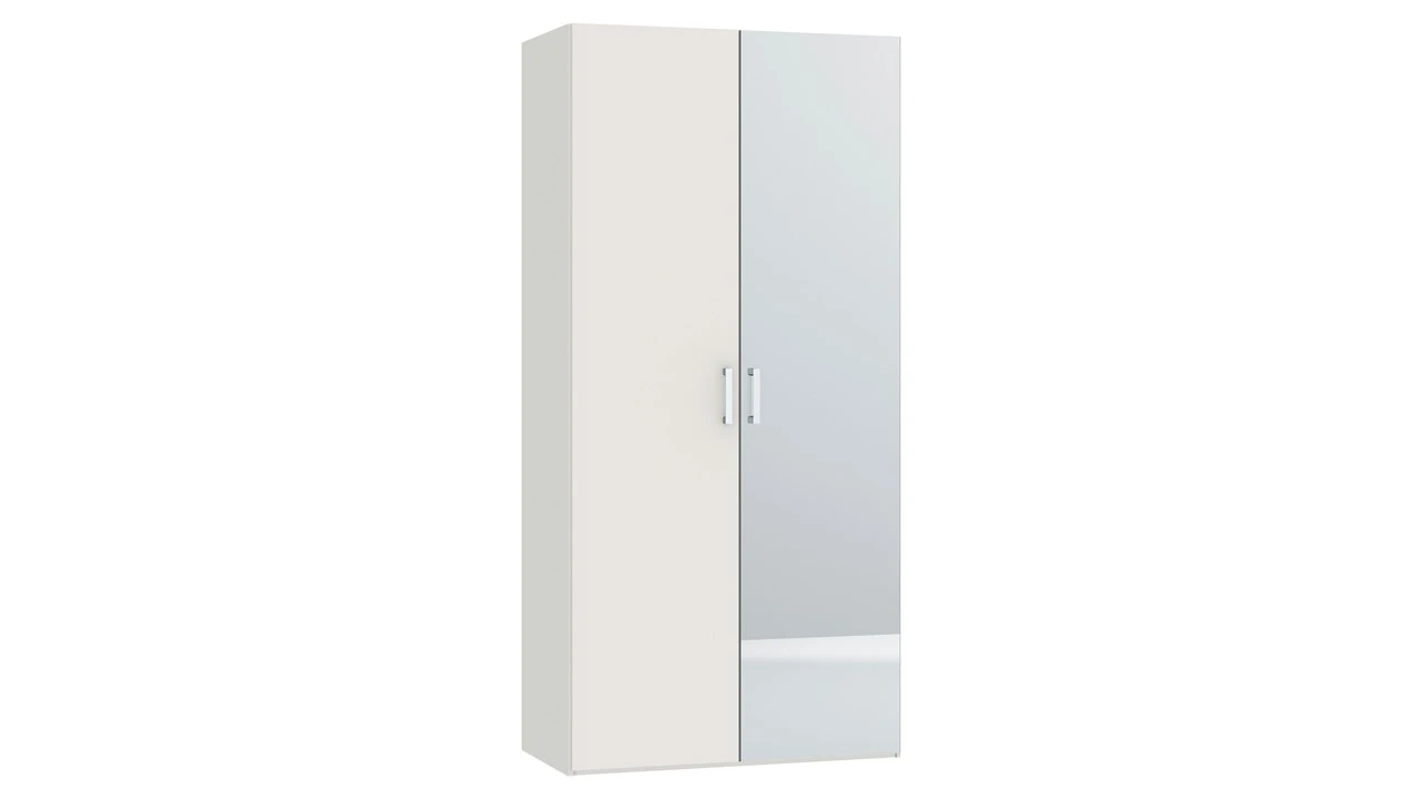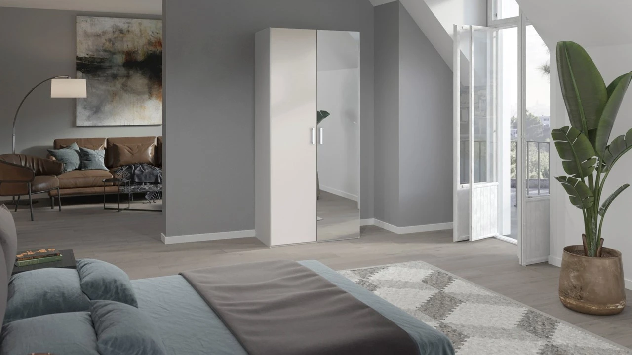 Met deze eenvoudige Draaideurkast Compact met spiegel ga je voor een nette garderobekast voor een scherpe prijs. De kast is gemaakt van gefineerd spaanplaat. De indeling van de kast kun je vinden onder het kopje ‘Kenmerken’. De kast is ook nog verkrijgbaar in varianten zonder spiegel of met laden.