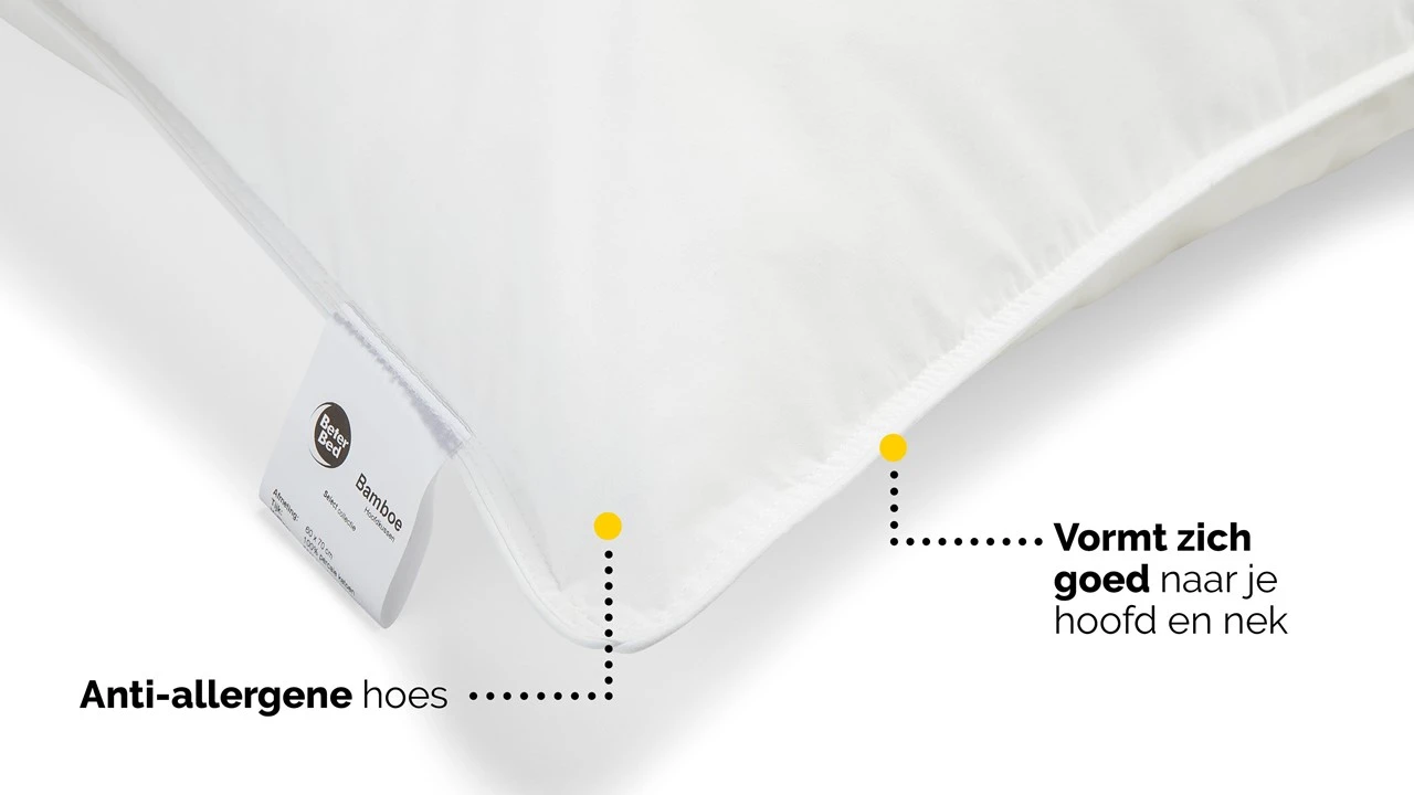 Dit hoofdkussen is zeer geschikt voor rug- en zijslapers. Het kussen is gevuld met 50% bamboe viscose en 50% synthetische vezels. Bamboe is een natuurlijk én veelzijdig materiaal dat zorgt voor goede ventilatie en uitstekende vochtregulatie. Hierdoor voert het warmte goed af, ideaal voor in de warme zomermaanden. De synthetische vezels zorgen voor een goede veerkracht. Het kussen vormt zich perfect naar de vorm van je hoofd.
